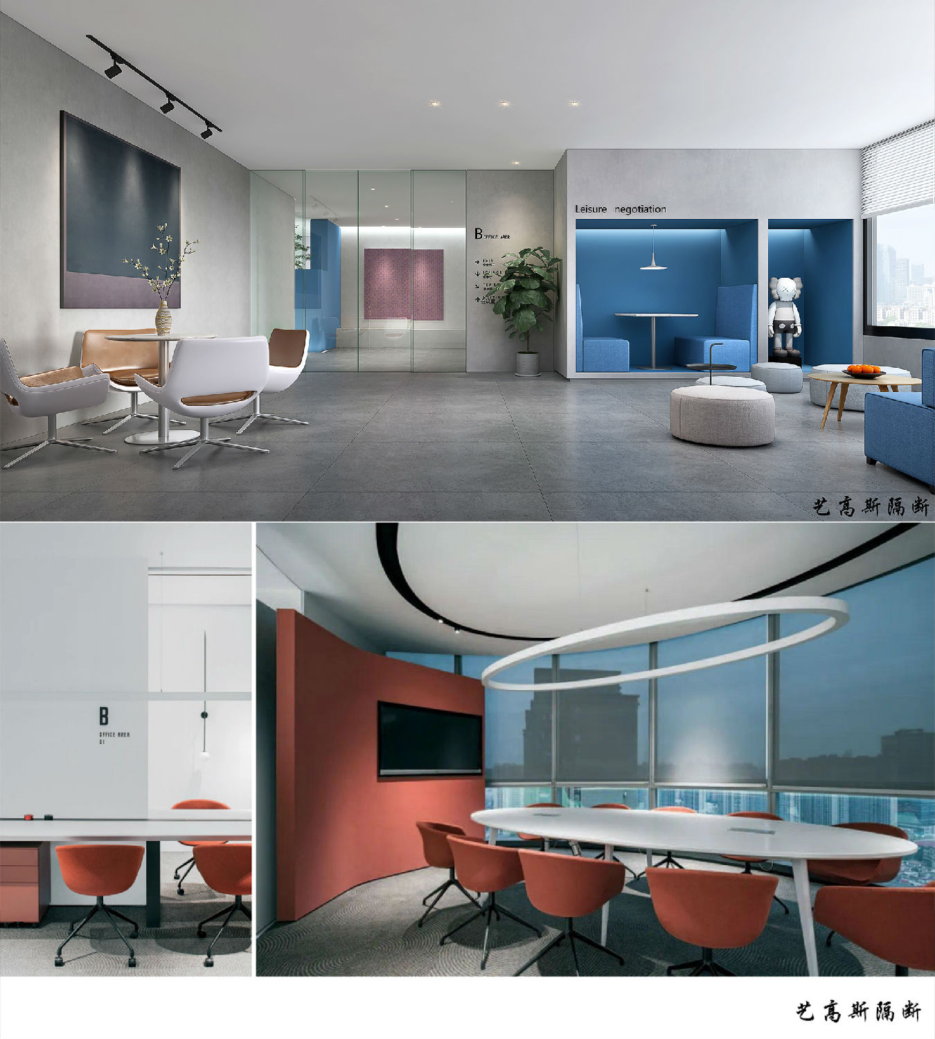 項目整體的設計風格配合了銀灰色係的地板以及深藍色基調的牆板,形成了一個“優雅、時尚、舒適”的辦公場景,全麵提升了辦公室的氣質與形象,增加了員工在工作時的熱情和舒適感。
